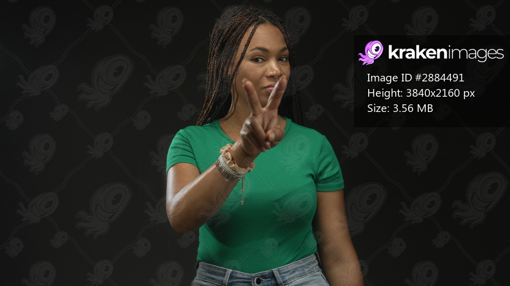 Young african american woman in green top making a peace sign with fingers and wrist bracelets in black studio; playful attitude.