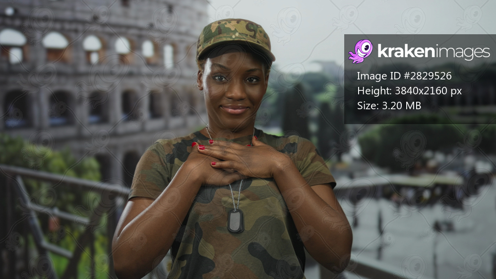 Young african american woman in military camouflage uniform opens arms wide at roman building overlooking ancient ruins; pride duty.