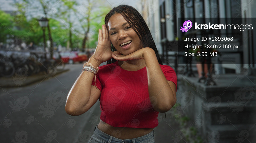 Young african american woman in red crop top framing her face with hands, smiling and waving on a city street; joy playful confidence.
