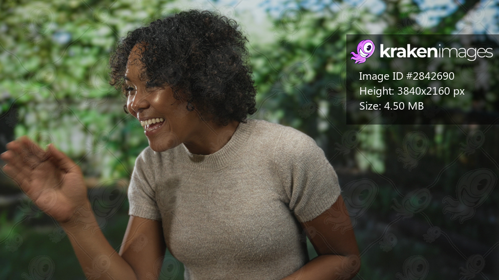 Young african american woman in sunlit green park smiling and laughing with raised hands wearing beige sweater; joy.