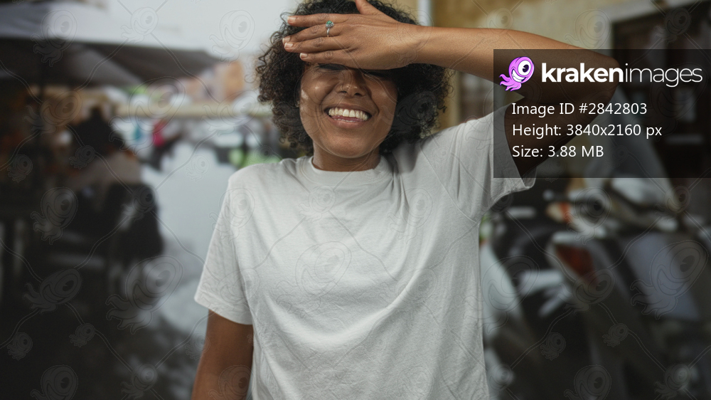 Young african american woman in white tshirt covers eyes with hand on bustling city street; embarrassment.