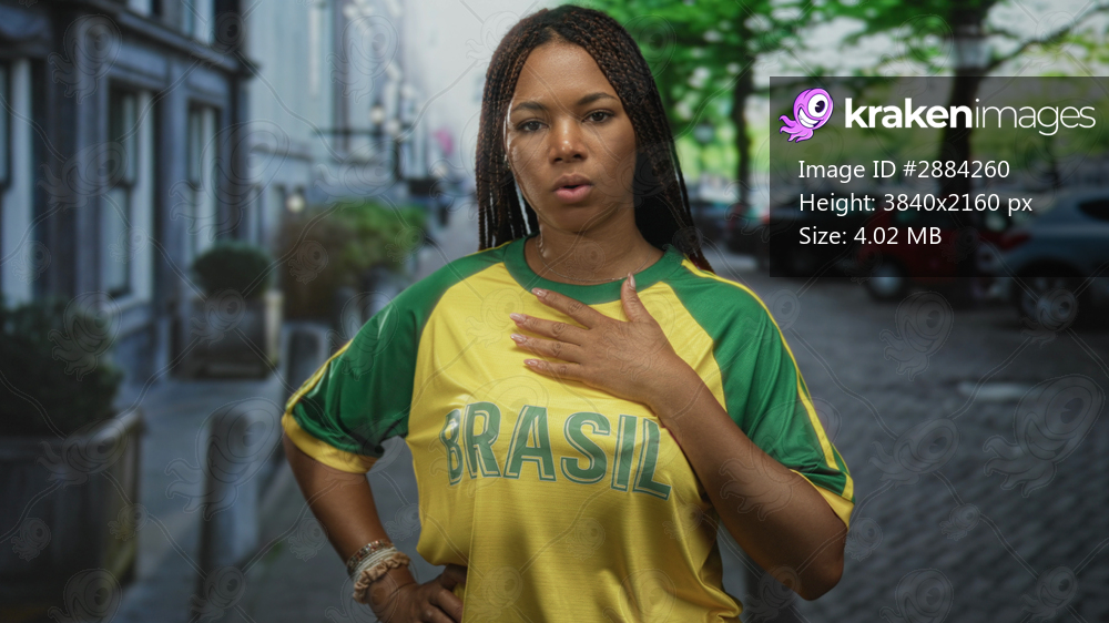 Young african american woman in yellow brasil football jersey with hand on chest on cobblestone city street; national pride concern.