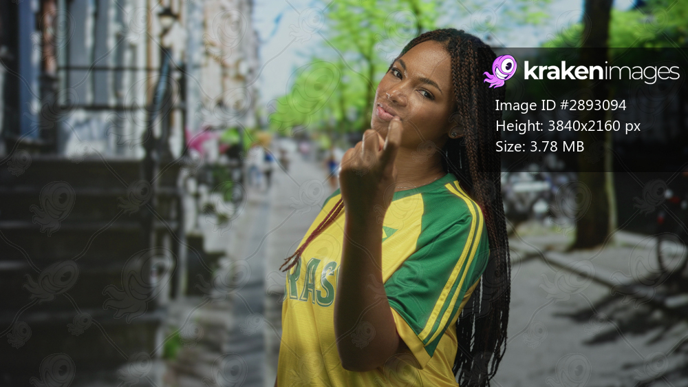 Young african american woman in yellow green brazil jersey beckons with finger on city street; confidence invitation.