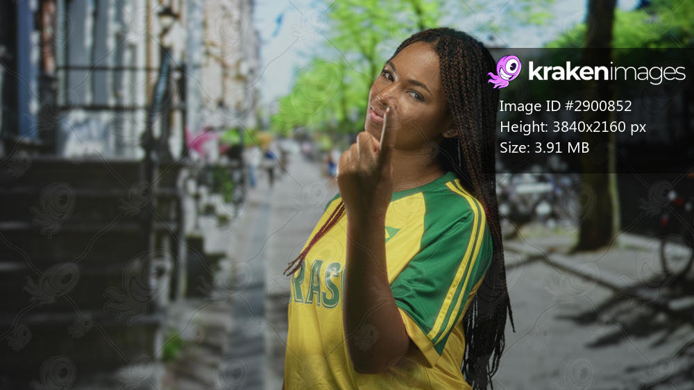 Young african american woman in yellow green brazil jersey beckons with finger on city street; confidence invitation.