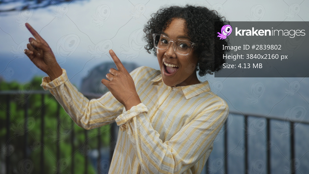 Young african american woman in yellow shirt and glasses pointing finger to ocean view on street balcony; excitement.