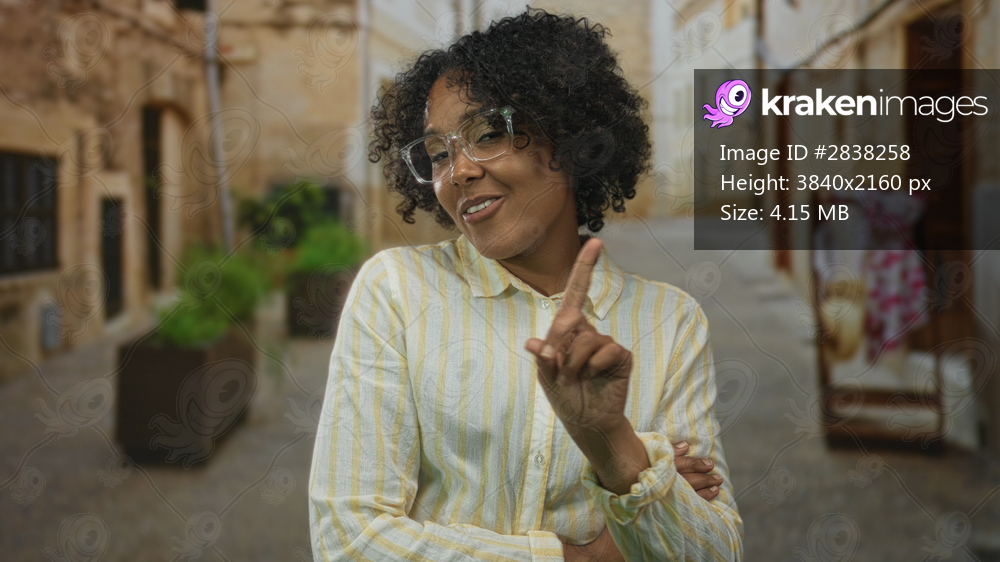 Young african american woman in yellow striped linen shirt crosses arms and points finger along stone paved street; confidence.