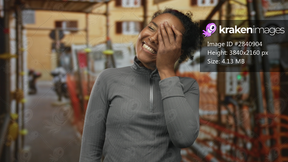 Young african american woman laughing and covering her face with hand at an outdoor building construction site scaffolding; joy.
