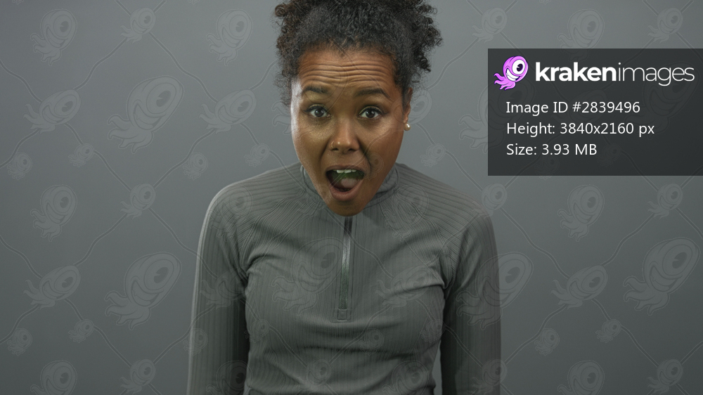 Young african american woman leaning forward with mouth open and raised eyebrows in a grey studio; astonishment.