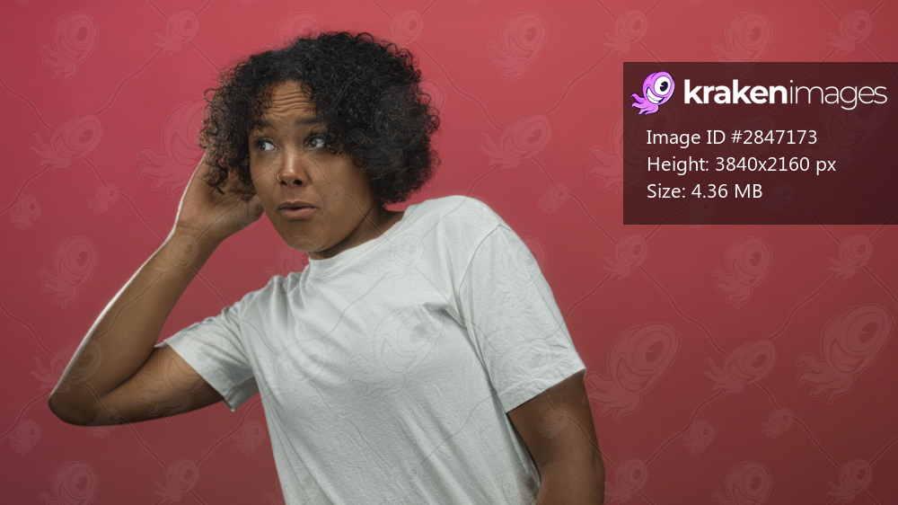 Young african american woman leans forward and holds hand to ear in pink studio listening pose; curiosity attention.
