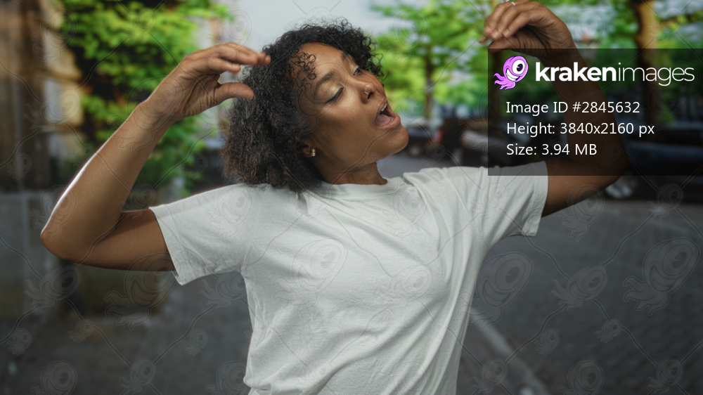 Young african american woman lifts both hands to frame her curly hair and head on a bustling city street; confidence.
