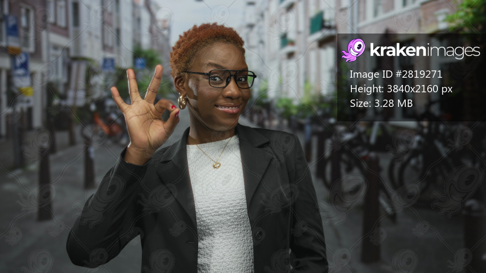 Young african american woman making ok sign with hand near bike parking on sunlit urban city street; approval.