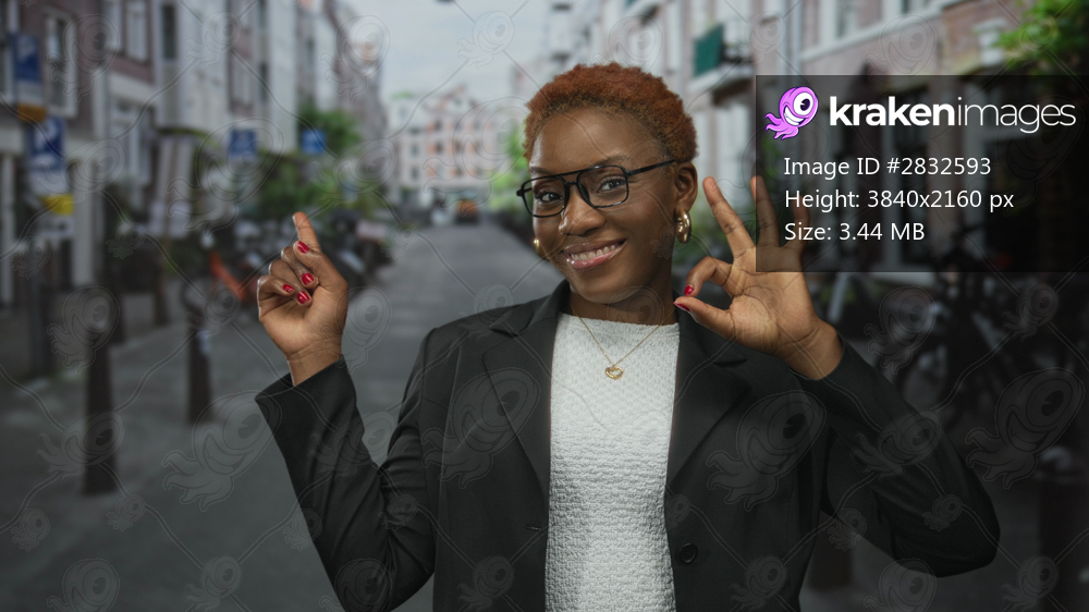 Young african american woman making ok sign with hand near bike parking on sunlit urban city street; approval.