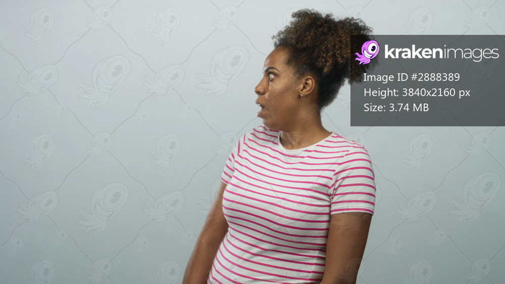 Young african american woman mouth open looking sideways in studio with light blue backdrop wearing pink striped tee and hair in curly puff; surprise reaction. - Kraken Images