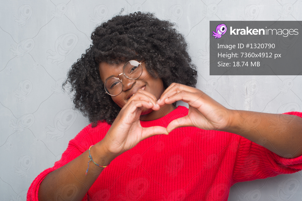 Young african american woman over grey grunge wall wearing winter sweater and glasses smiling in love showing heart symbol and shape with hands. Romantic concept. - Kraken Images