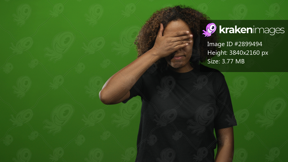 Young african american woman peeking through fingers and covering face with hand in studio green backdrop; shyness self protection.