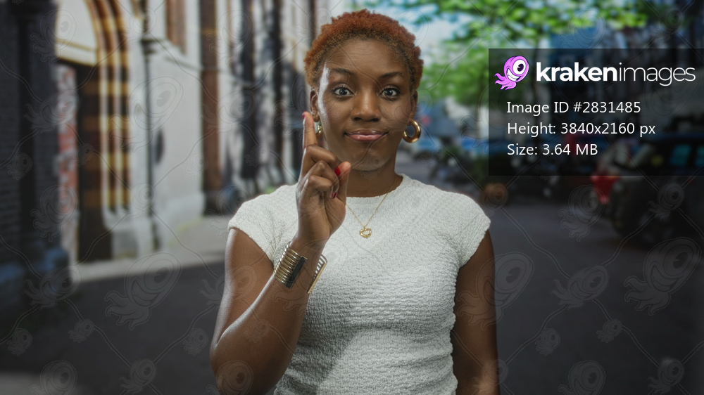 Young african american woman places finger to lips for silence on busy city street amid passing cars and storefronts; quiet confidence.