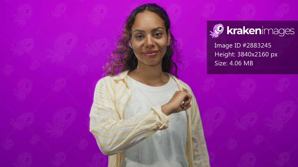 Young african american woman places hand on chest in studio against purple backdrop, eyes closed and smiling, wearing white tee and yellow striped shirt; serenity mindfulness. - Kraken Images