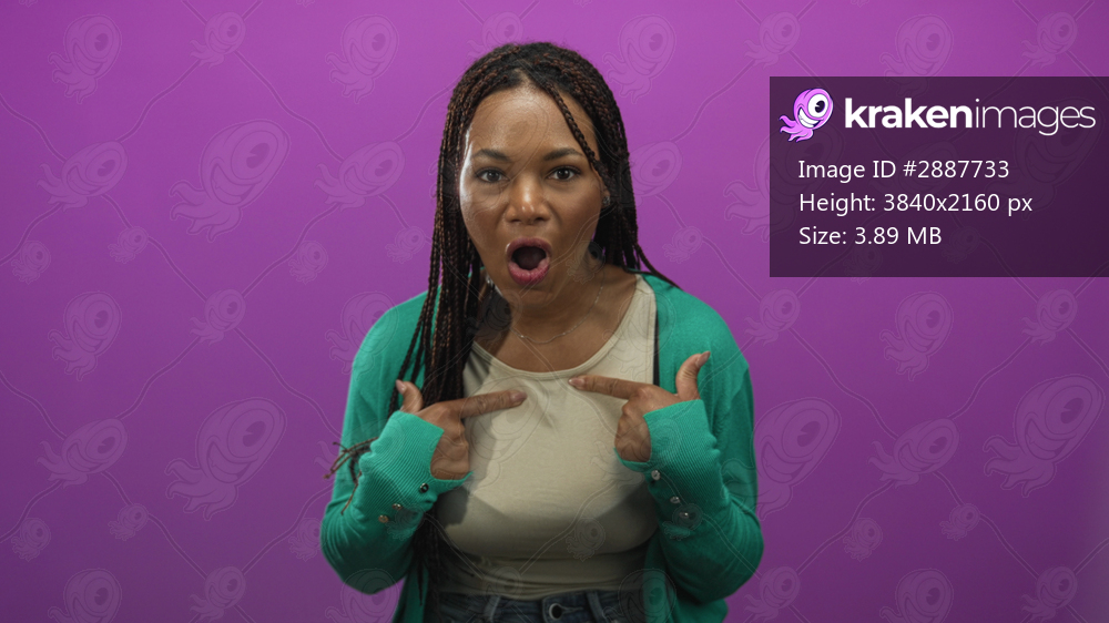 Young african american woman pointing both index fingers to her chest with mouth open in purple studio; surprise disbelief.