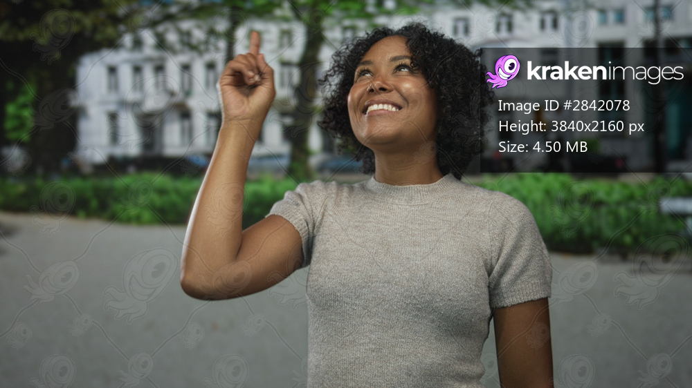 Young african american woman pointing finger to building on street with a bright smile beneath city trees and architecture; optimism.