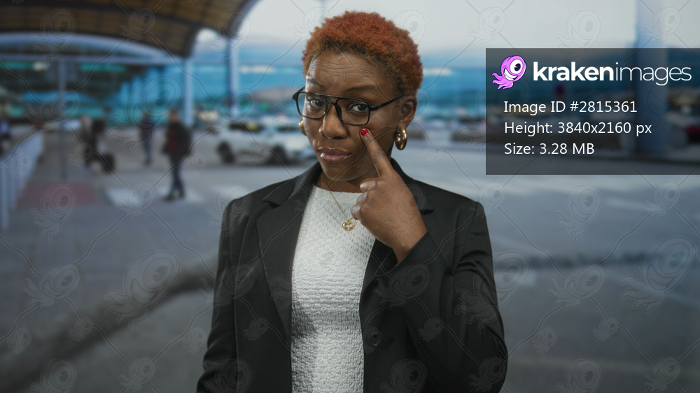 Young african american woman pointing finger to eye at a busy airport terminal curb under canopy; self awareness.