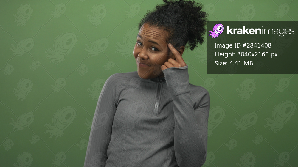 Young african american woman pointing finger to head with contemplative expression in a green studio setting; thinking.