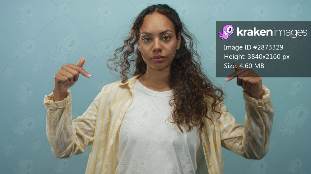 Young african american woman pointing fingers at her white t shirt and chest in light blue studio; confidence empowerment.