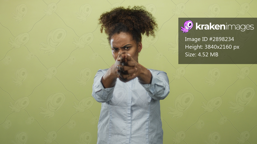 Young african american woman pointing fingers forward with both hands, aiming straight ahead, wearing light blue shirt in green studio; determination.