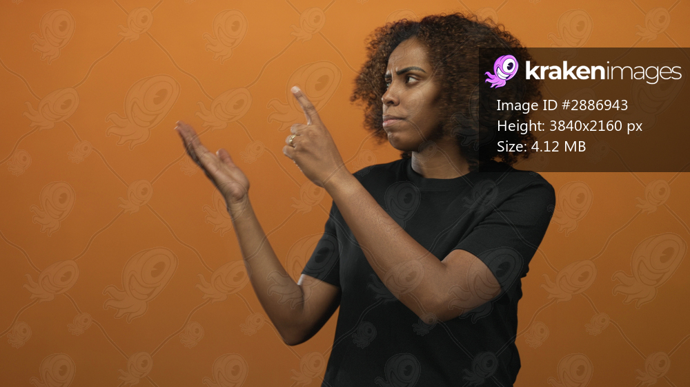 Young african american woman pointing with hand in orange studio, open palm and index finger directed forward; focus instruction.