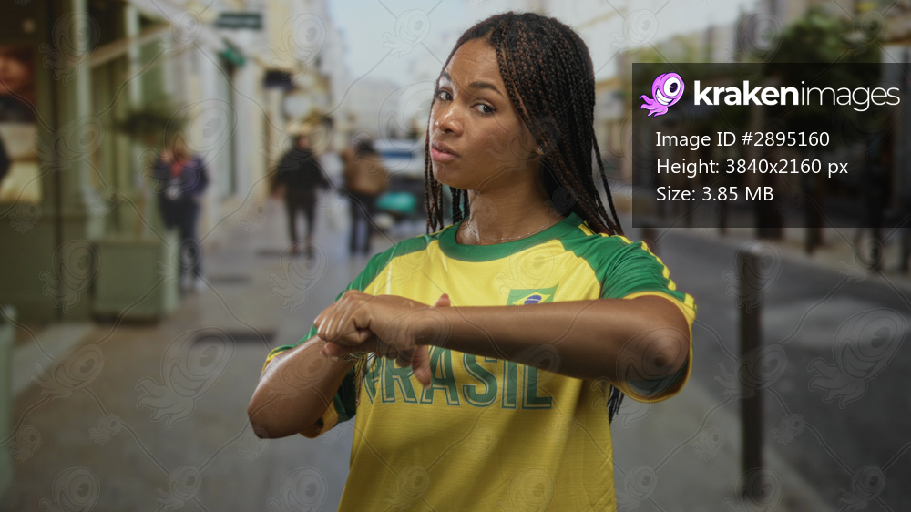 Young african american woman pointing to wrist on busy city street in brazil jersey, bracelets and scrunchie visible; impatience timekeeping.
