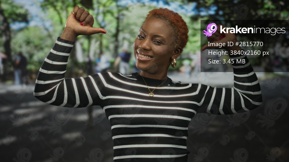 Young african american woman points both thumbs to chest in bustling city street daytime scene; confidence.