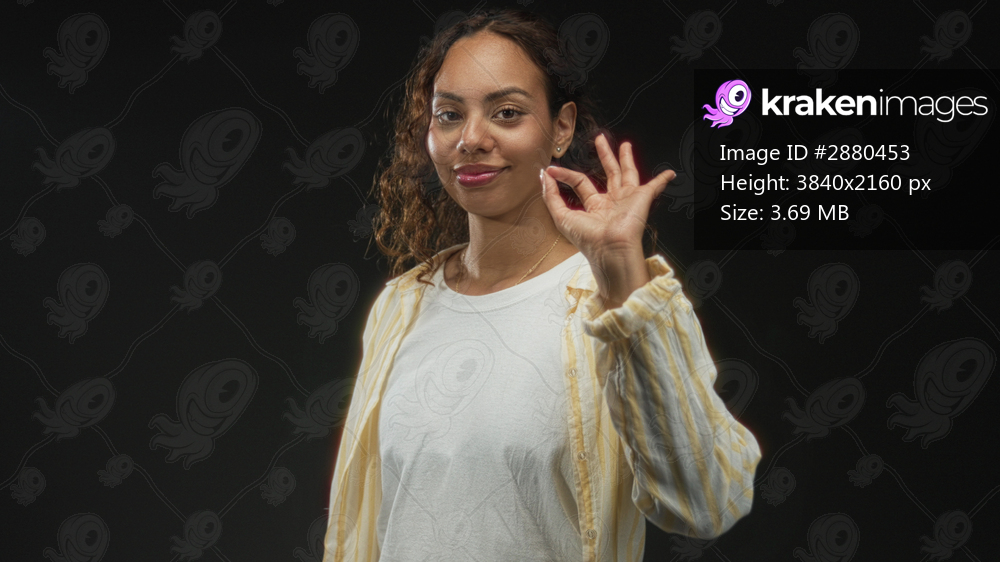 Young african american woman points finger with face forward wearing white t shirt and yellow striped shirt in black studio; confidence ease.