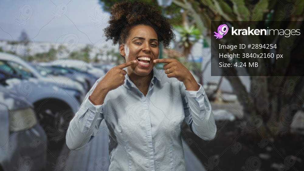 Young african american woman points finger to teeth on street next to parked cars, smiling broadly with hands visible; joy confidence.