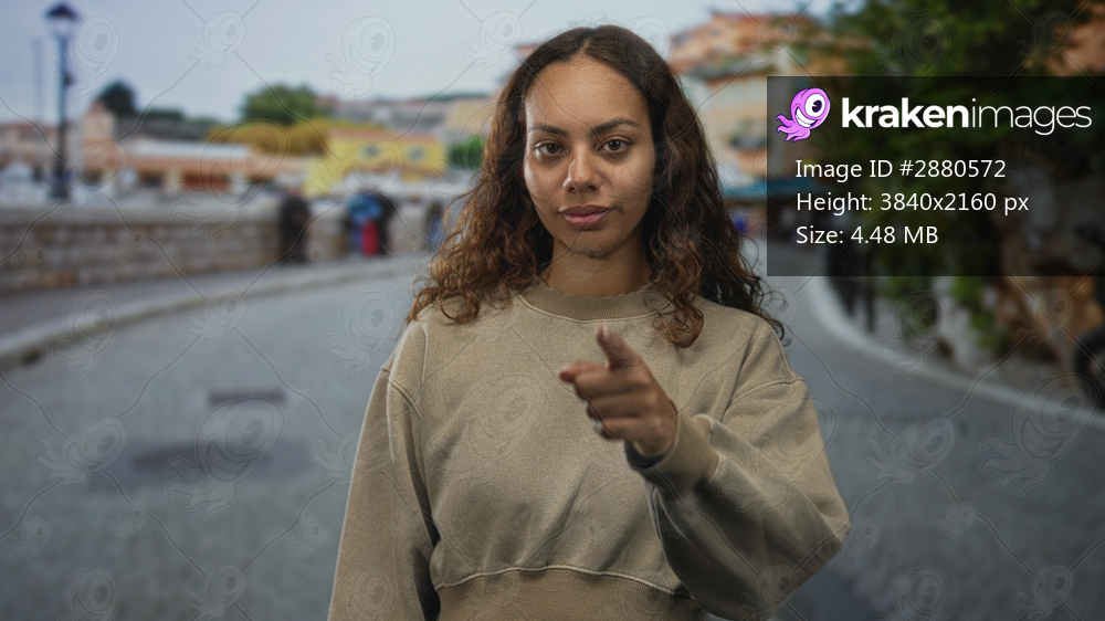 Young african american woman points finger toward camera with visible hand gesture wearing casual sweatshirt on cobblestone street in city center; confidence poise assertiveness. - Kraken Images