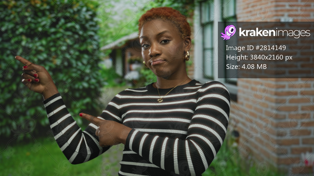 Young african american woman points fingers with both hands to left at brick building entrance; skepticism doubt cynicism indifference.