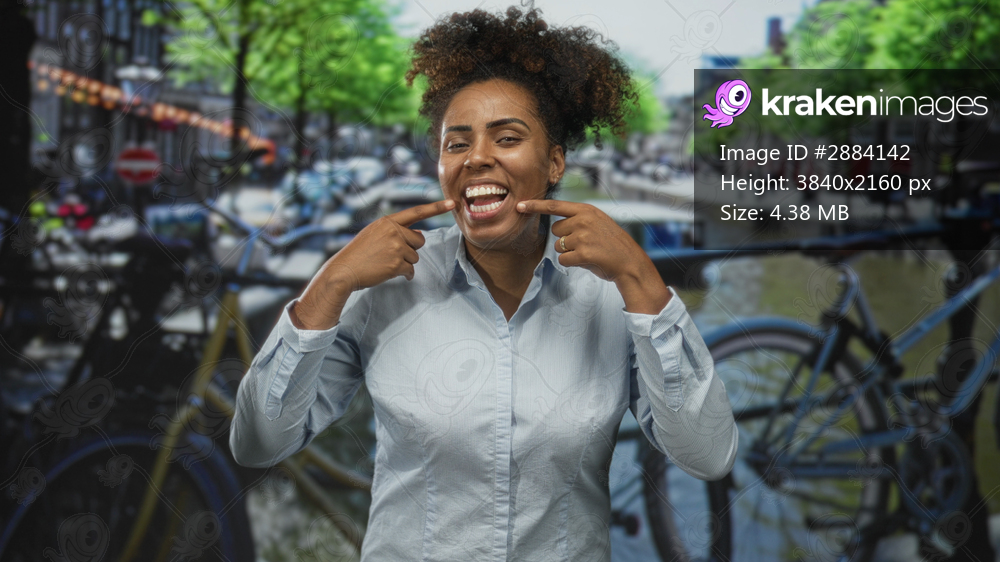 Young african american woman points fingers to teeth on a street in amsterdam by a canal and bicycles, smiling broadly with visible hands and teeth; joy playfulness confidence. - Kraken Images