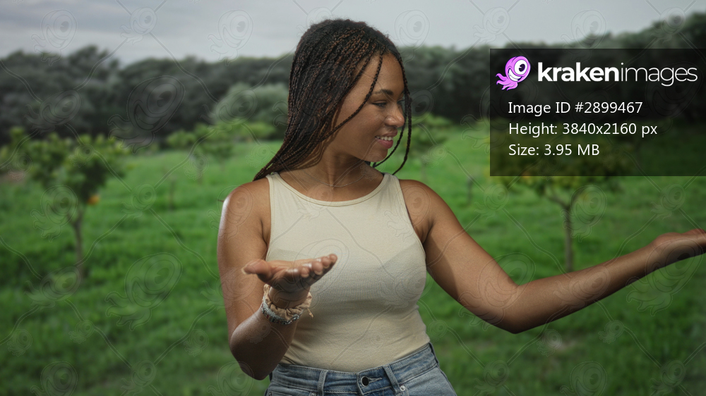 Young african american woman presenting with open palms and bare arms in forest meadow, smiling and gesturing toward the green field; calm optimism.
