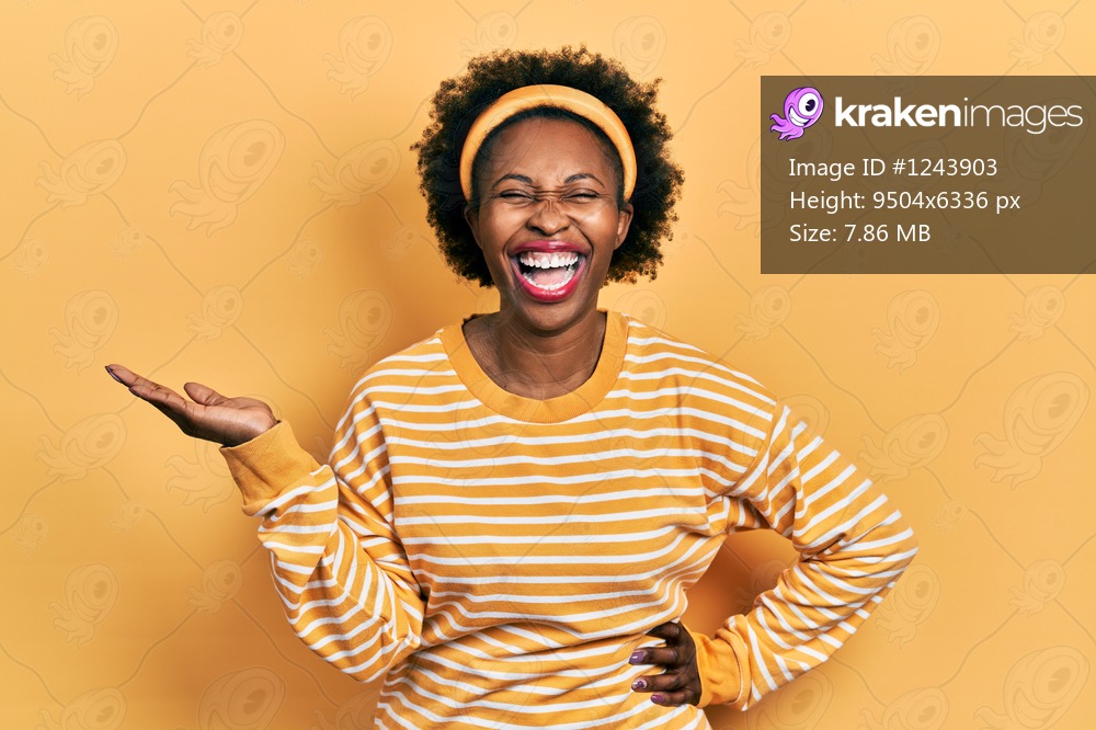 Young african american woman presenting with open palms, holding something smiling and laughing hard out loud because funny crazy joke.