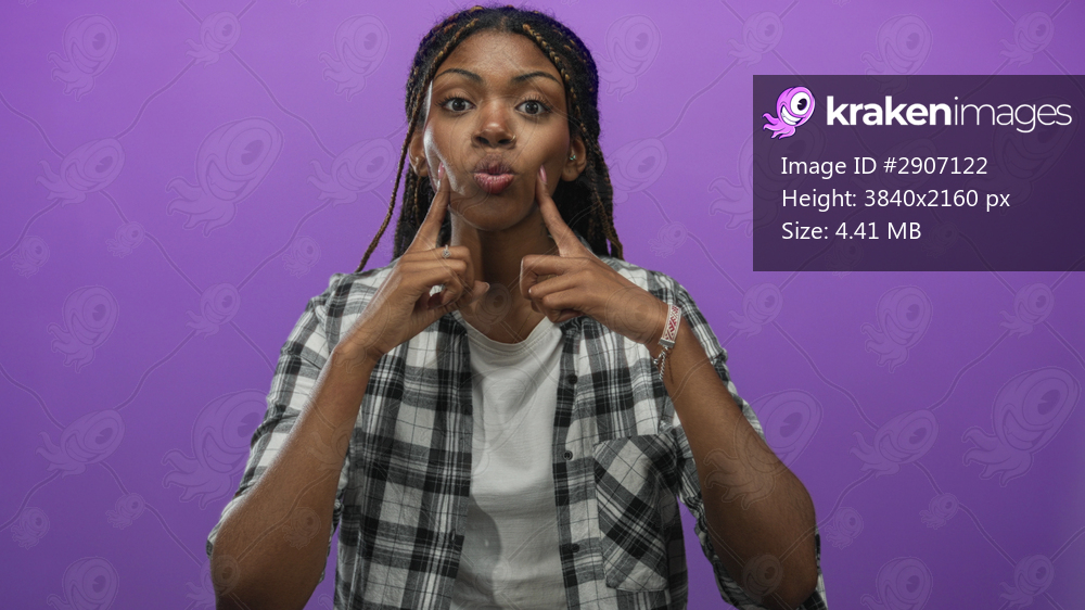 Young african american woman pressing fingers to her cheeks and puckering lips while wearing a black and white plaid shirt in a purple studio; playful confidence. - Kraken Images