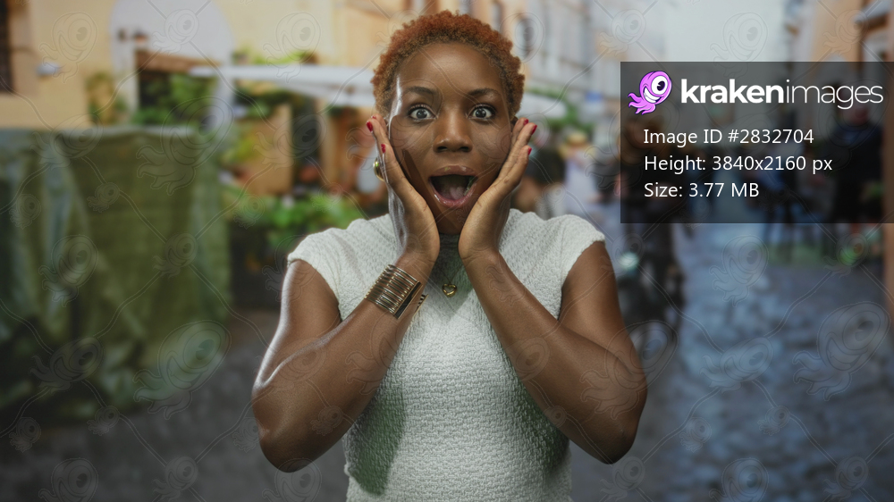 Young african american woman raises both palms at shoulder height on a narrow cobblestone street; astonishment.