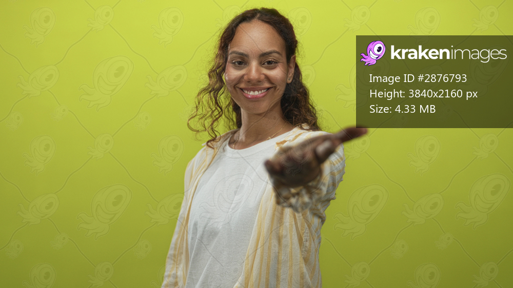 Young african american woman reaching hand forward smiling in studio with lime green backdrop; welcoming connection.