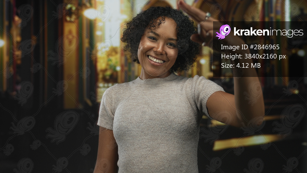 Young african american woman salutes with hand to forehead and smiles inside church building; faith devotion reverence.