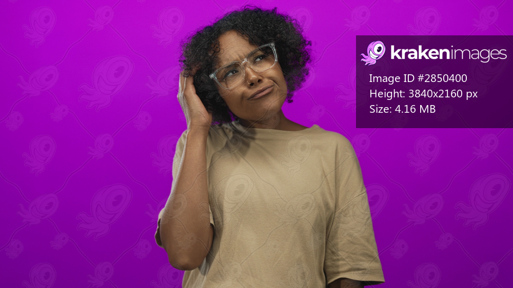Young african american woman scratches head wearing clear glasses and beige shirt in purple studio; uncertainty curiosity introspection questioning.