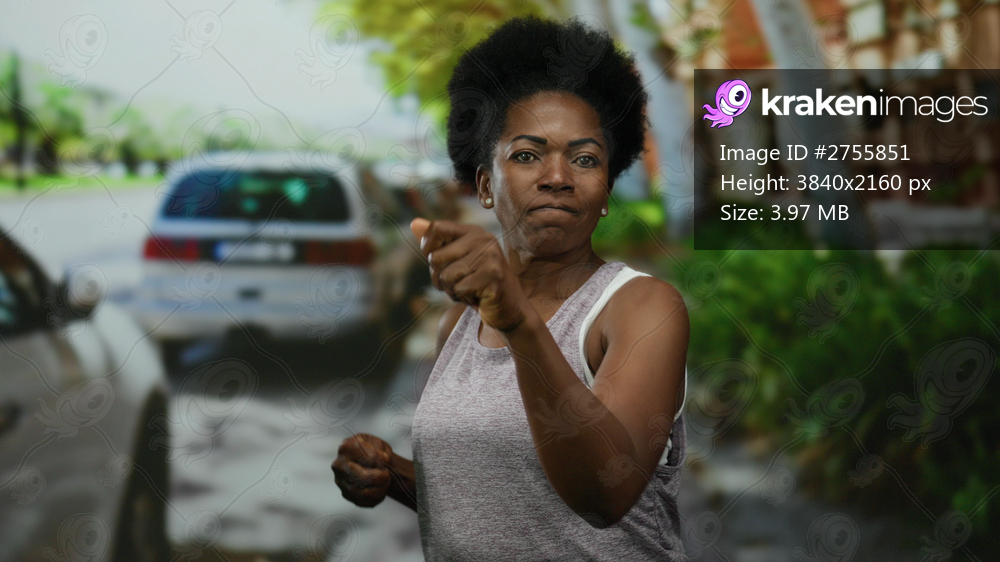 Young african american woman shadowboxing on a sunlit city street with cars and greenery capturing intensity and strength in an urban outdoor setting.