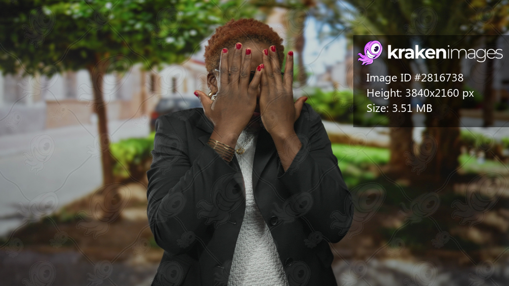 Young african american woman shields face with spread palms on sunlit street lined with trees and buildings; surprise.