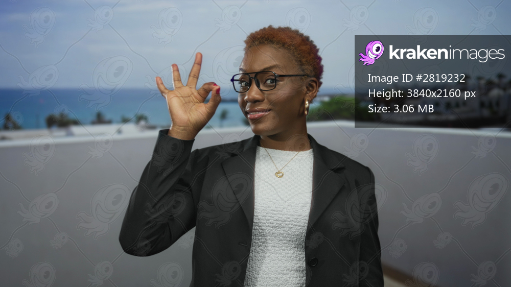 Young african american woman shows hand ok sign gesture on building terrace overlooking sea and skyline; approval.