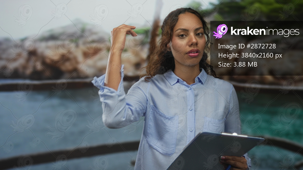 Young african american woman shows middle finger while holding clipboard and pen at rocky seaside railing; defiance protest boundary.