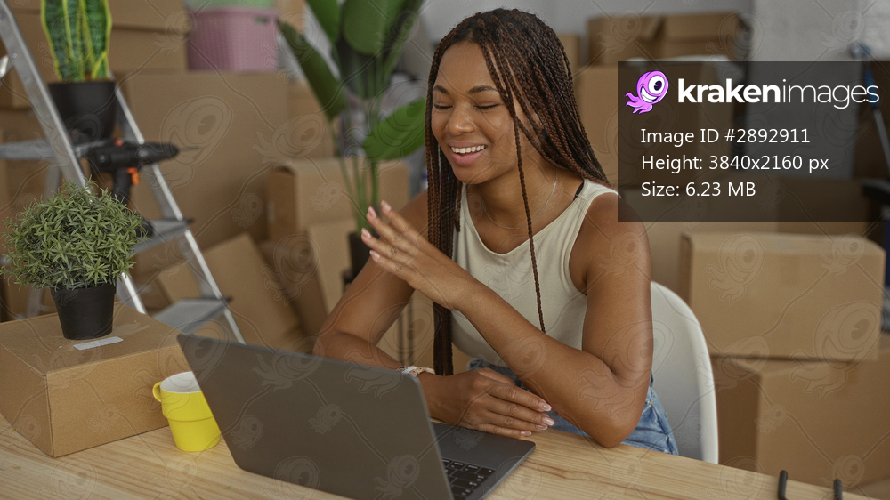 Young african american woman smiles at laptop amid packed moving boxes in house; new home optimism beginning.