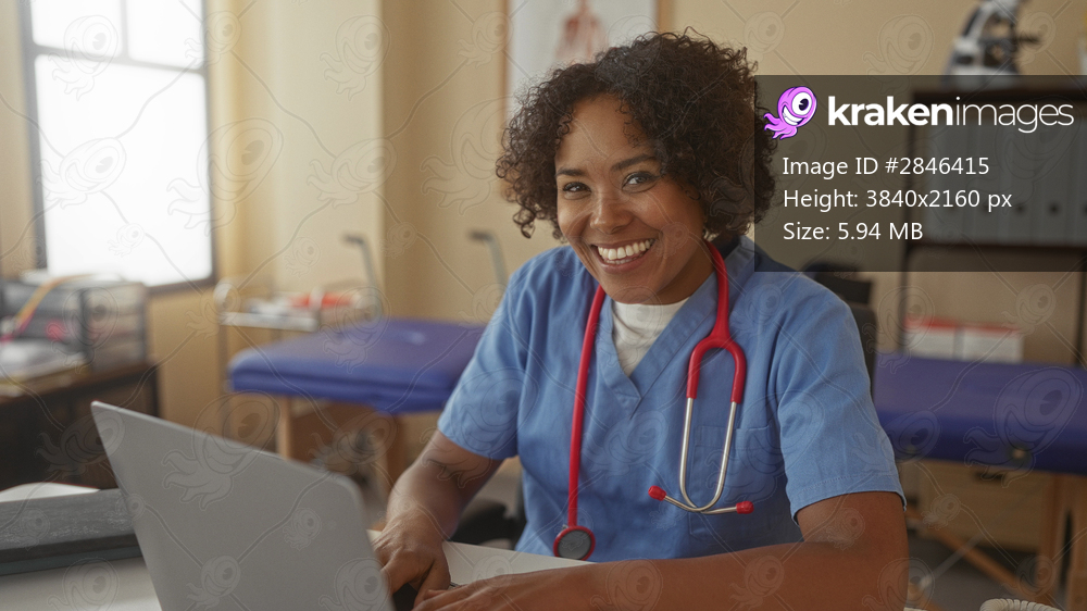 Young african american woman smiles at laptop on clinic desk with stethoscope in building; confidence.