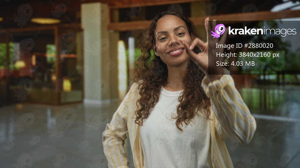 Young african american woman smiles and makes ok sign and thumbs up with hand toward camera in hotel building lobby; confidence welcome.