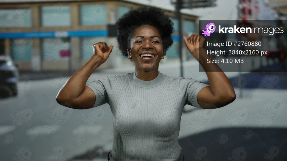 Young african american woman smiling cheerfully on a city street with blurred buildings in the background raising her arms joyfully outdoors in daytime. - Kraken Images